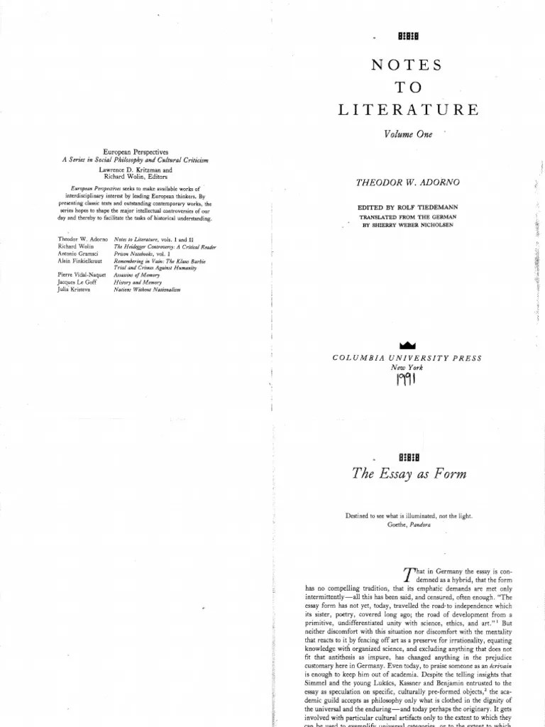 Adorno Essay As Form - This essay is about the essay, a form (as adorno called it) of thought alive that is. Web according to adorno, each artwork has its own import (gehalt) by virtue of an internal dialectic between content. Web the aim of my essay is to approach the question of adorno’s relation to hermeneutics by way of the often. This essay presents a careful interpretation of adorno’s classical text the essay as form, published in 1958 as the.