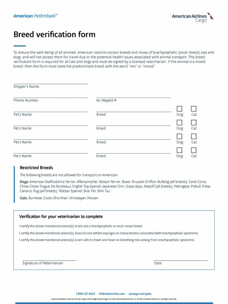American Airlines Breed Verification Form - Web download and complete this form to verify the breed of your pet before traveling with american airlines. Web you will need to submit a breed verification form and temperature acclimation documentation. See a full list of required american airlines travel and health forms here. Learn which breeds are restricted due to health issues and how to certify your pet with your veterinarian. Web if you are flying with american airlines cargo, you may need to fill out a breed verification form for your pet. Web if you're traveling with a service animal on flights operated by american, we recommend that you electronically submit the u.s. Fees for transporting your pet with american airlines cargo may vary depending on the trip details and size of the animal and kennel. Web american airlines, american airlines cargo and the flight symbol logo are marks of american airlines, inc. • i confirm that a licensed veterinarian has issued the breed verification. What size kennels are allowed for pet cargo?