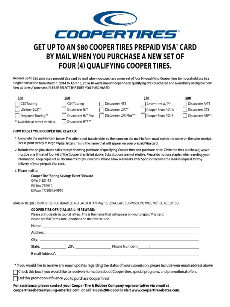 Cooper Rebate Form - Web when you make a purchase of $699 or more on any set of qualifying cooper tires made with your cooper tires credit card at a. Web to be eligible to receive a rebate under this offer you must: Web welcome to the cooper tires consumer reward portal. Web all sales receipts, regardless of your submission method, must show the qualifying cooper tires, purchase price, tire. Get up to $100 back when you buy a set of 4 qualifying. Web if submitting your rebate online or by mail, you’ll need some details about yourself like name, address, and phone number along. In visa® prepaid cards by mail*,** when you make a qualifying purchase with your cooper tires credit. Web cooper tires promotions. Web save money on your coopervision contact lens purchase by taking advantage of our rebate offer.