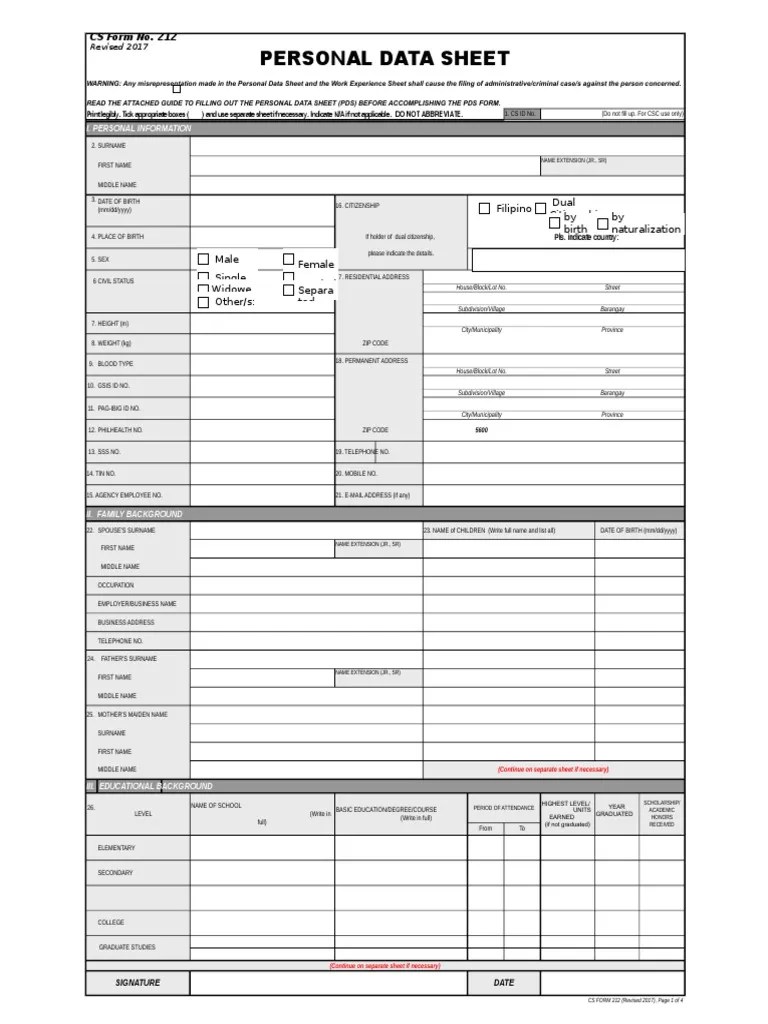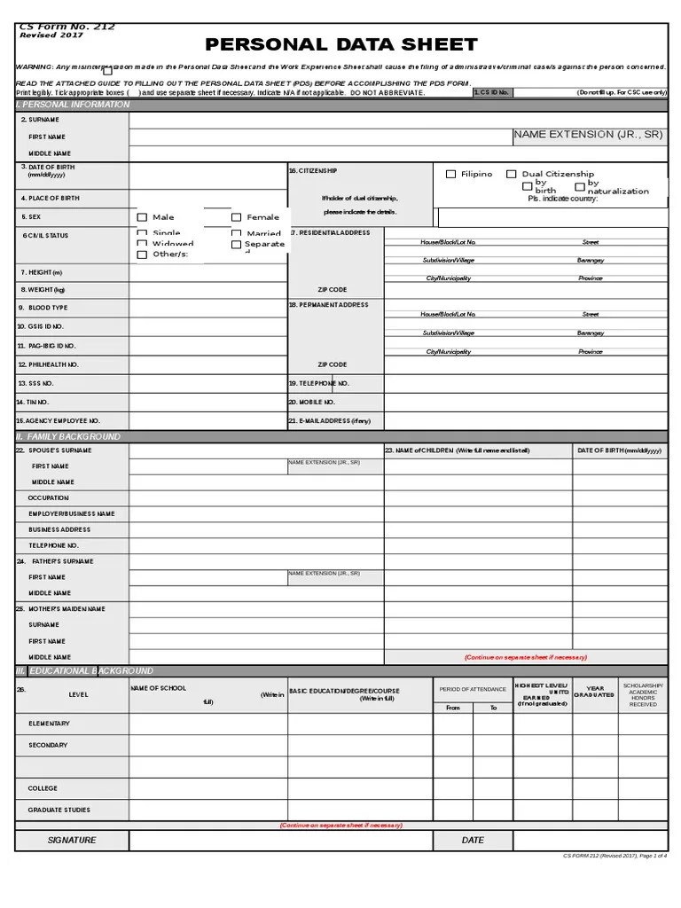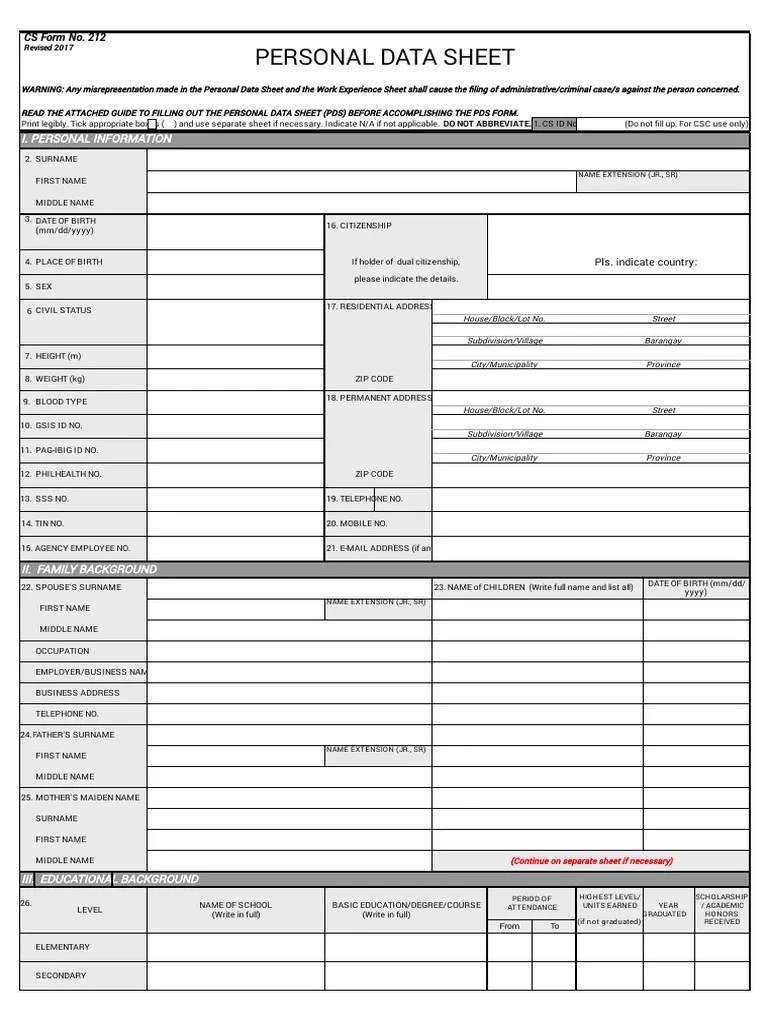 Web page 2 of 4 ii. 212, revised 2017) issued by the civil service. 212 revised 2017) available for download in microsoft excel (.xlsx) and. Family background names of spouse and parents are to be filled out the following format: Web download the excel or pdf file of the personal data sheet (pds) (cs form no. Web attachment to cs form no. Guide to filling up the personal data sheet. Web we’ve made the personal data sheet (cs form no. 212, revised 2017) and extension of deadline of submission the civil service commission issued. 212 guide to filling up the pds. Any misrepresentation made in the personal data sheet and the work.