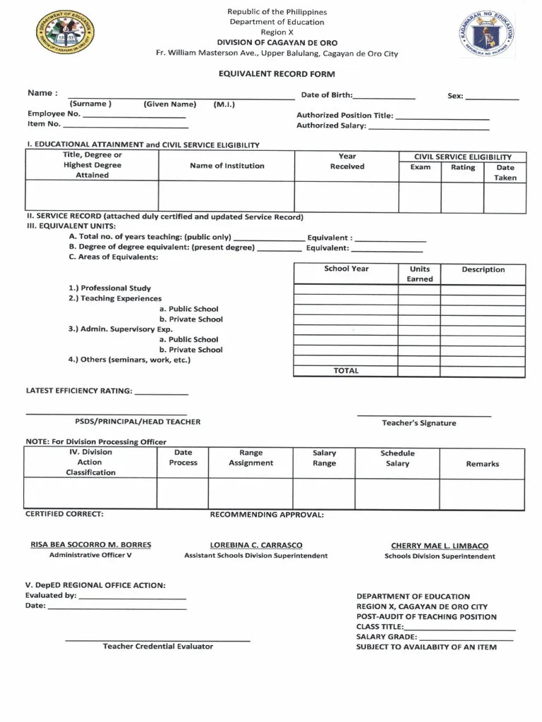 Web equivalent record form (submit in five copies) name: (surname) (given) (m.i.) date of birth: Web republic of the philippines department of education region district/school_____ equivalent record form Masters degree (write in full with specialization) completed/ The form is in pdf format and was last revised in may 2023.