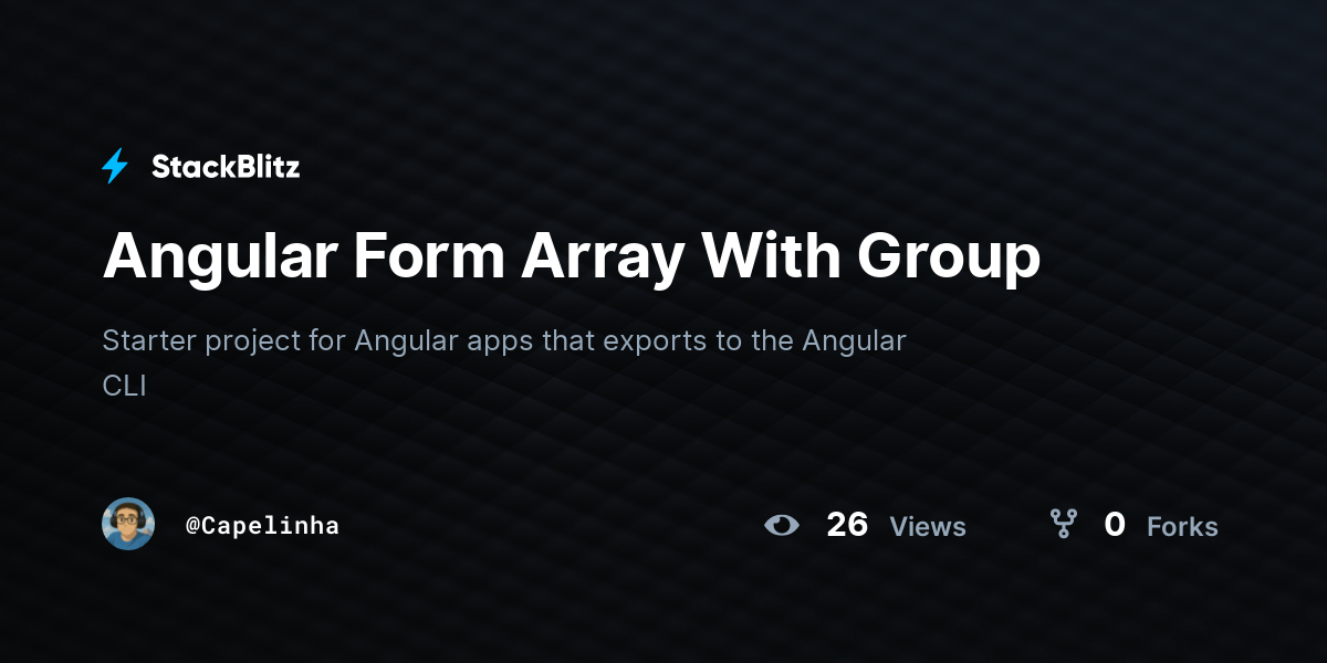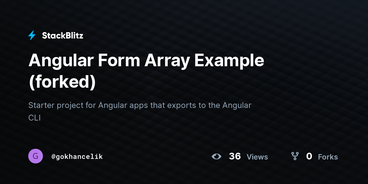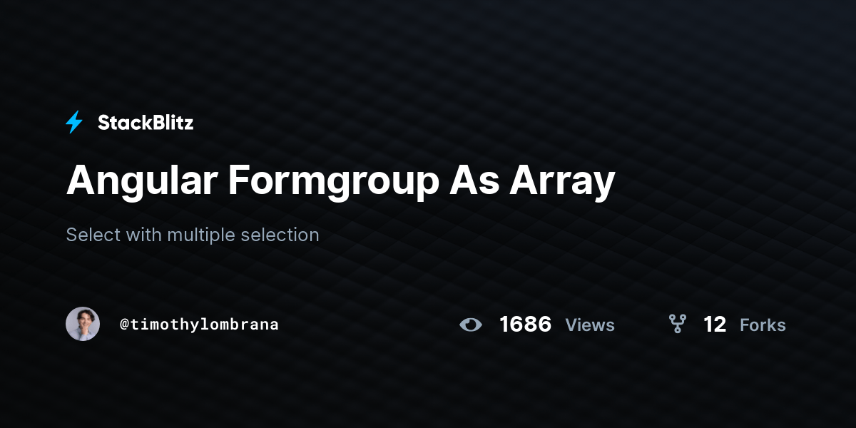 Form Array In Angular Stackblitz - Web learn how to use formarray to add controls dynamically to reactive forms in angular. Web a question and answers about how to use formarray in a dynamic form builder component in angular. See a simple app that allows adding and. Web to start using forms, first import the appropriate module into app.module.ts and insert it into the “imports” array: See how to add, remove and update. See an example of an. Web the form element uses the [formgroup] directive to bind to the dynamicform formgroup in the app component above. Web learn how to build dynamic angular forms with formarray by adding or removing form controls at runtime.