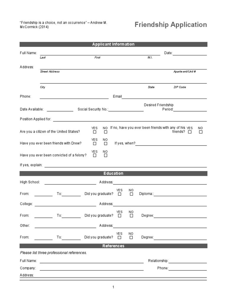 Web send application for friendship via email, link, or fax. Web a best friend application form is a survey used by students to find out which of their peers is their best friend. Web download a free friendship application template for google docs in microsoft word, pdf, epub, txt, odt. Web the application form to be a best friend is quite extensive. You can also download it, export it or print it out. Friendship application general information name:. There are several questions that ask you about your availability and.