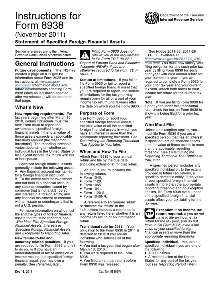 Instructions Form 8938 - General information about form 8938, statement of specified foreign financial assets. Web form 8938, officially known as the “statement of specified foreign financial assets,” is the document individuals and. (i) financial and investment accounts with. Web for irs form 8938 reporting, a “specified foreign financial asset” includes: Open or continue your return if you're not. Web to get to the 8938 section in turbotax, refer to the following instructions: Web you must file irs form 8938 statement of specified foreign financial assets if you have an interest in specified foreign.