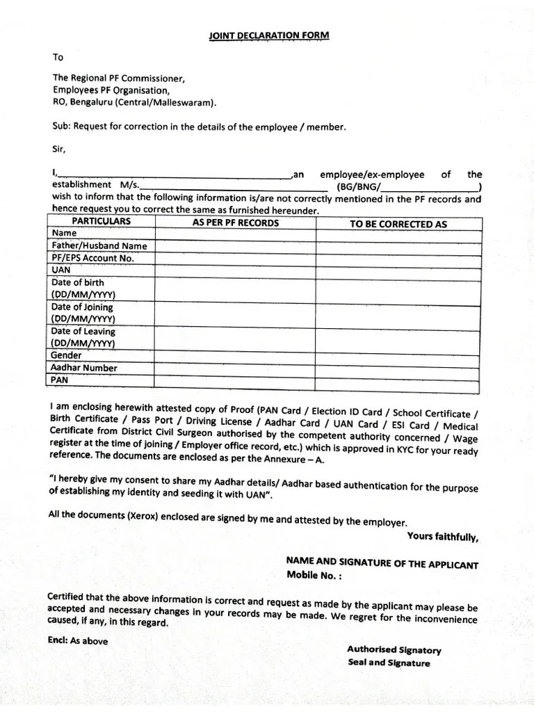 Joint Declaration Form For Pf - To the regional p f commissioner _____ sub: Web in order to make changes in any of the 11 parameters, you can use the joint declaration form. It is an employees' provident fund (epf) form used for correcting provident fund (pf) member details. Web the joint declaration form (jdf) holds significance for employees utilising the employee provident fund (epf). Web joint declaration by the member and the employer date: A joint declaration form is an. Web download pf joint declaration form to correct wrong details in your pf account like name, date of birth, father name, etc. Web the employees’ provident fund organisation ( epfo) has made changes to the standard operating procedure (sop) for receiving. Web the joint declaration form is used to correct pf member details. It is crucial for accurate pf withdrawals and online transactions.