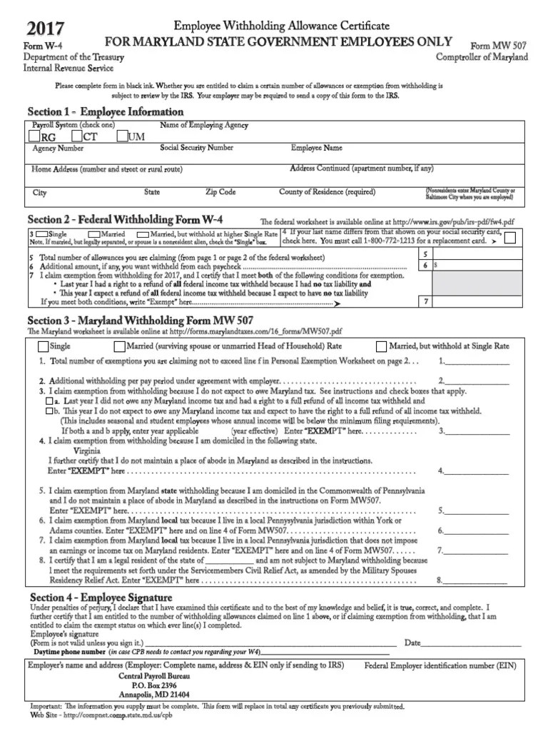 Maryland W4 Form - Employees may be required to adjust their personal exemption. Web find the forms and instructions for withholding maryland income tax from employees' pay. Your withholding is subject to review by the irs. Form used to apply for a refund of the amount of tax withheld on the 2021sale or transfer of maryland real property interests by a nonresident individual or nonresident entity which is in excess of the transferor/seller's tax liability for. Your withholding is subject to review by the irs. Amount if their federal adjusted gross income exceeds $100,000,. Web for maryland state government employees only. Application for tentative refund of withholding on 2021 sales of real property by nonresidents. For maryland state government employees only. Download the mw4 form and other forms for 2022, such as mw507, mw508, and mw506.
