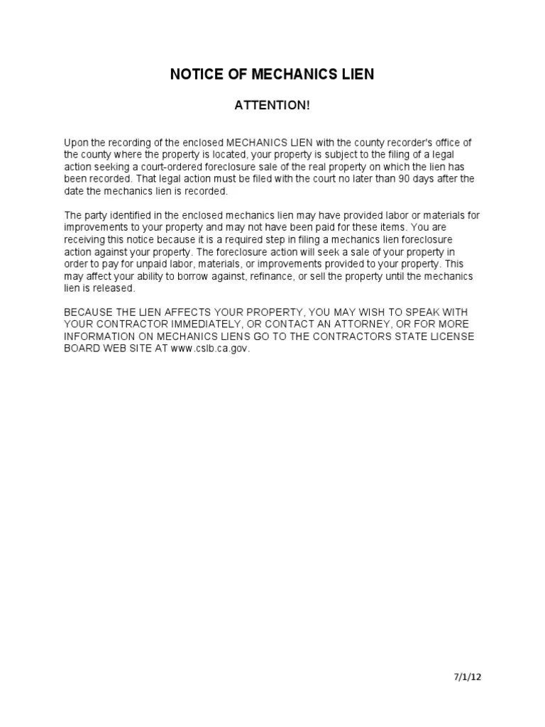 Mechanics Lien Warning Form - Web _____ (“claimant”) claims a mechanics lien for the labor or services or equipment or materials described in paragraph 2,. Web a mechanic’s lien form is a document that allows someone who is providing labor services or materials.