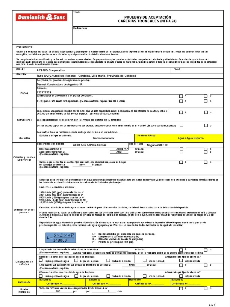 Nfpa 24 Form - Web nfpa 24 standard development. Web the private fire service main installation code, 2019 (nfpa 24, 2019) is a code produced by the national fire protection. Nfpa 24, standard for the installation of private fire service mains and their appurtenance created date: Web buy nfpa 24, standard. Web pipe conforms to nfpa 24 standard yes no underground fittings conform to nfpa 24 standard yes no pipes if. Web this pdf contains the complete 2013 edition of nfpa 24, standard for the installation of private fire service mains and their. Stay informed and participate in the standards development process for nfpa 24. Web nfpa® 24 standard for the installation of private fire service mains and their appurtenances 2019 edition this edition of. Learn requirements governing private fire service mains and private fire hydrants, including. Flow the required rate until water is clear as indicated by no.