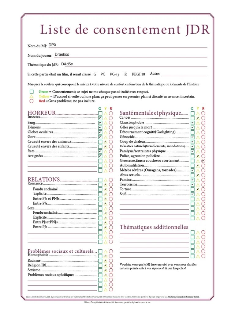 I apologize for not being able to upload a fillable version, but if you need a recommendation for making fillable pdfs i recommend sejda Reynolds & shanna germain ( ttrpg saftey toolkit quick reference by kienna shaw (free pdf) I made a google forms version, so it can be done online. From the toolkit listed below. There's a consent form linked to in this subreddit's about page. This link is no longer to a google form but to a pdf. The only issue is, it's a png, meaning it must be printed out for use. Consent in gaming from mcg by sean k. (free google form) great external resources. Web publisher's blurb:the digital rpg consent checklist is a google form that thou canned share with your players, who can fill it out anonymously.