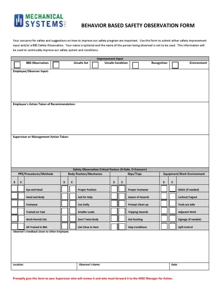 Safety Observation Form - Web create and customize your own online job safety observation form with this free template. In this report, a safety officer can determine which tasks or environments pose a liability to the company. An infograph of hierarchy of controls is included in this template as the safety officer’s reference. Use this checklist to easily observe safe behavior such as the right selection of tools for the job, proper lifting techniques, and more. Web freely download professionally created safety observation report template. Web safety observation form is used to identify hazards in the workplace. Collect observations about the job safety from the companies and store them securely in your jotform account. You can download the template in microsoft word, pdf or excel spreadsheet formats. Web a safety observation report is a document that inspects workplaces to find potential dangers that might compromise a worker’s right to safety and health. Provide details of the hazard and the appropriate control measure needed.