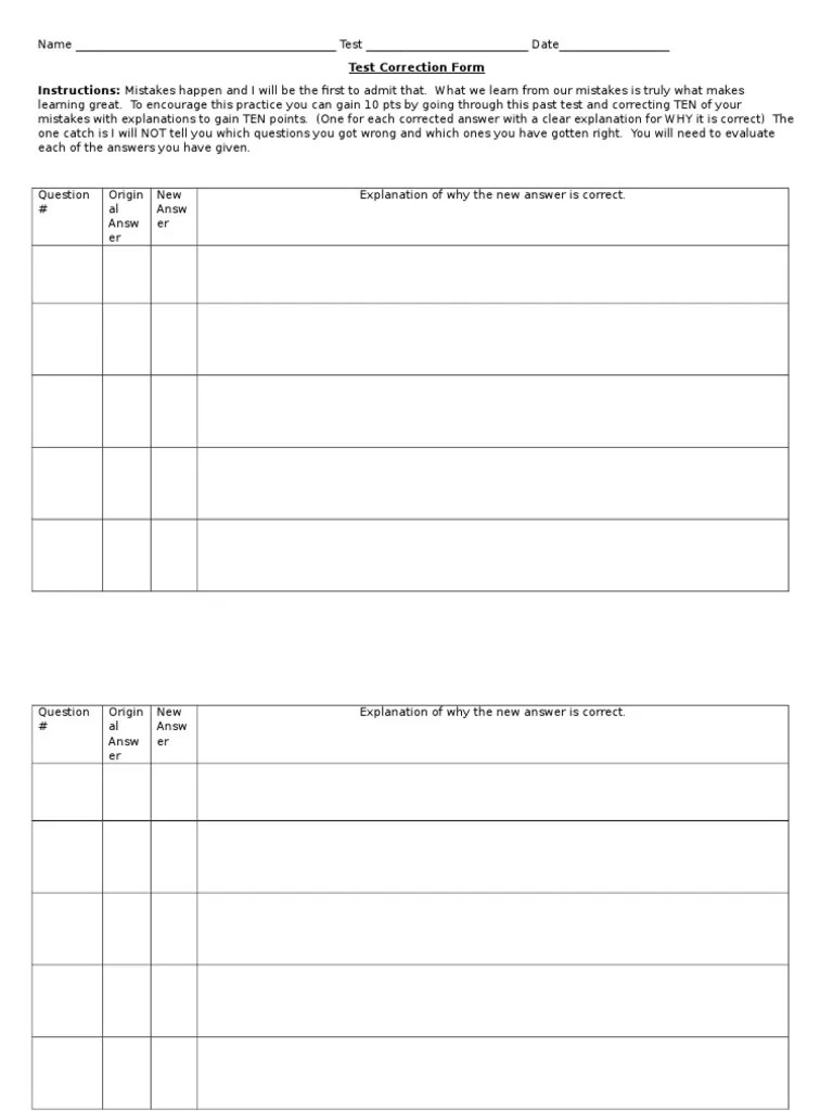 (why you chose the answer you did) Use additional sheets if necessary. # incorrect answer how did i get this wrong? Fill out this form completely and accurately! Web test correction form name _____ p _____ attach original test to this form for credit. It is easy for students to use, as well as easy for teachers to grade or check! You will get ½ point for every correction that is explained thoroughly and correctly. When completed, staple original test behind to this form. This is an easy to use form for students to complete after receiving test or quiz scores from a math assessment. Web this product includes 4 versions of a math test/quiz corrections form. No credit will be given for poor work or if the original test is not attached.