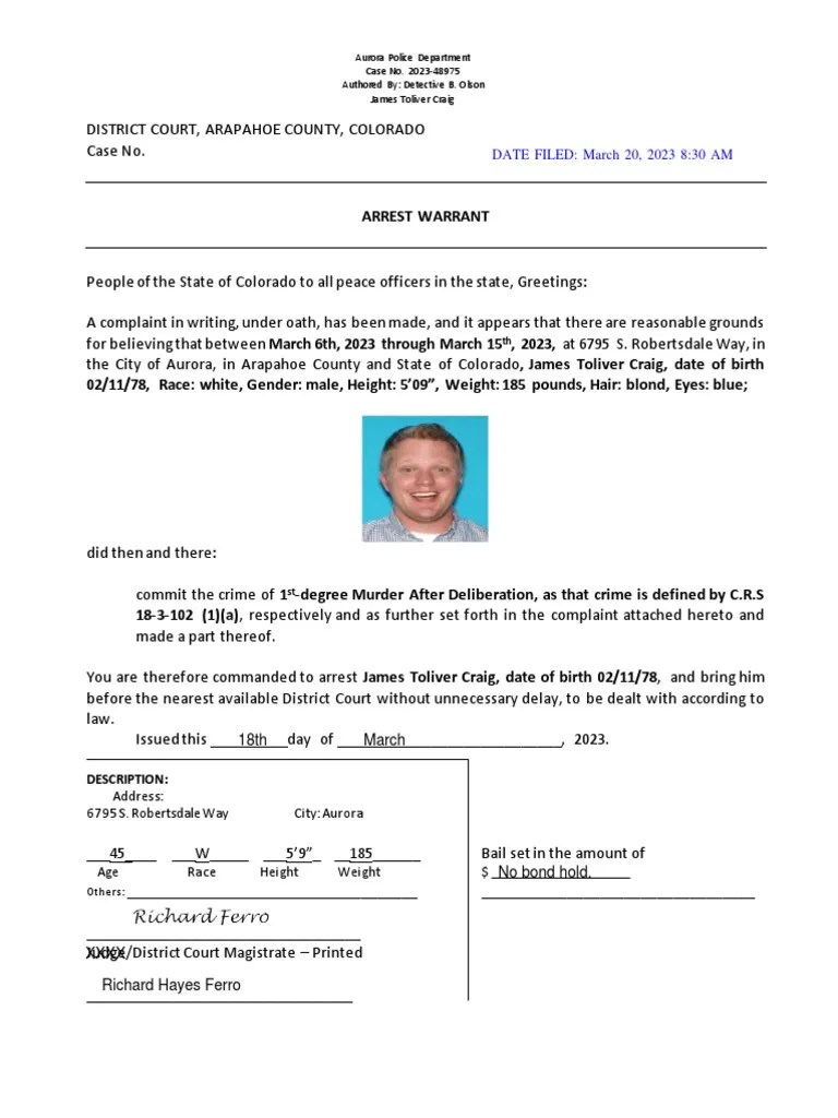 James Craig Arrest Affidavit - Web the arrest affidavit said that the investigation into craig started after his dental practice partner mentioned to a. Web james toliver craig, 45, was arrested early sunday morning by officers with the aurora police department's major. Web you are therefore commanded to arrest james toliver craig, date of birth 02/11/78, and bring him before the nearest available. Web through all of this, dr craig was making travel plans with and sending “sexually explicit” emails to an. Web the arrest affidavit said that the investigation into craig started after his dental practice partner mentioned to a.