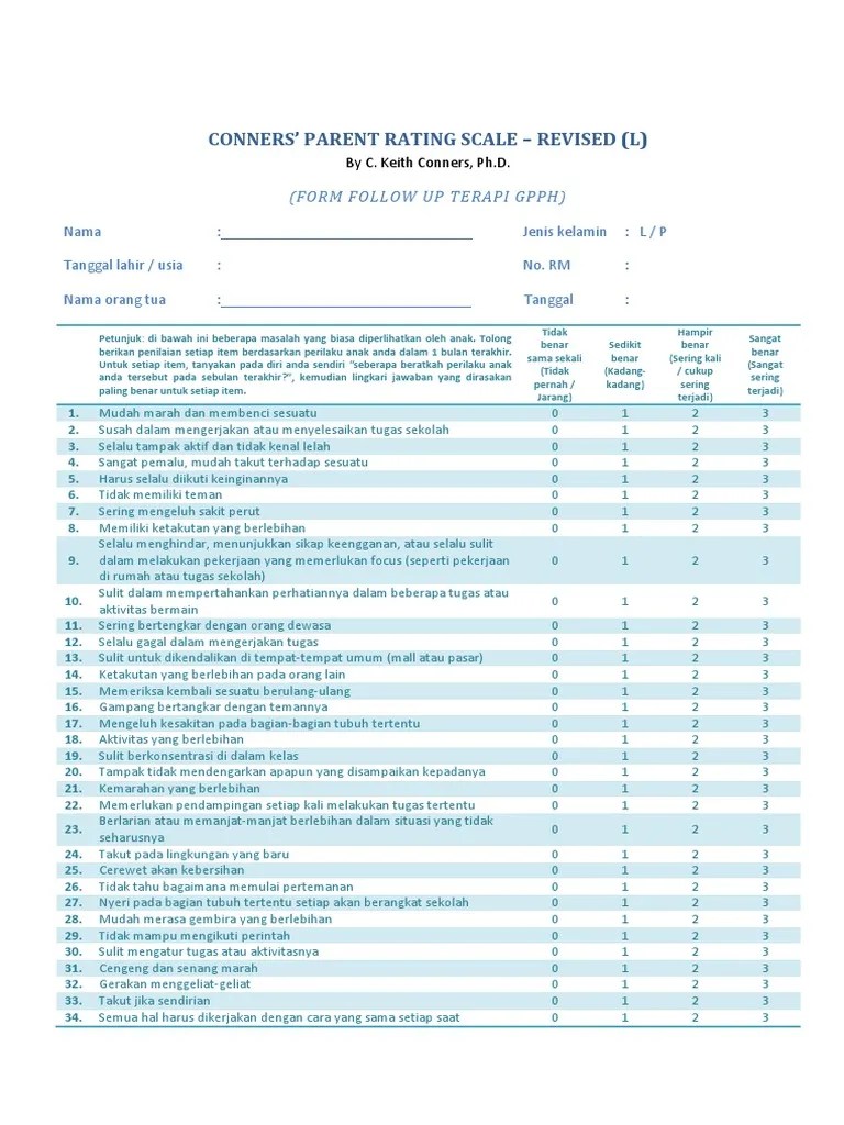 Printable Conners Scale Pdf - Blames others for his or her mistakes or 0. Conner’s cbrs teacher forms assess behaviors, concerns and academic problems in children between 6 and 18 years old and are reported by teachers. Is spiteful and wants to get even. M f (circle one) age: Web conner’s cbrs teacher rating scales. Please rate each item according to your child's behavior in the last month. Below are a number of common problems that children have. Keith conners, ph.d, revised (l) just a little true pretty very much much true true (often. Achenbach child behavior checklist (cbcl) Is touchy or easily annoyed by others.