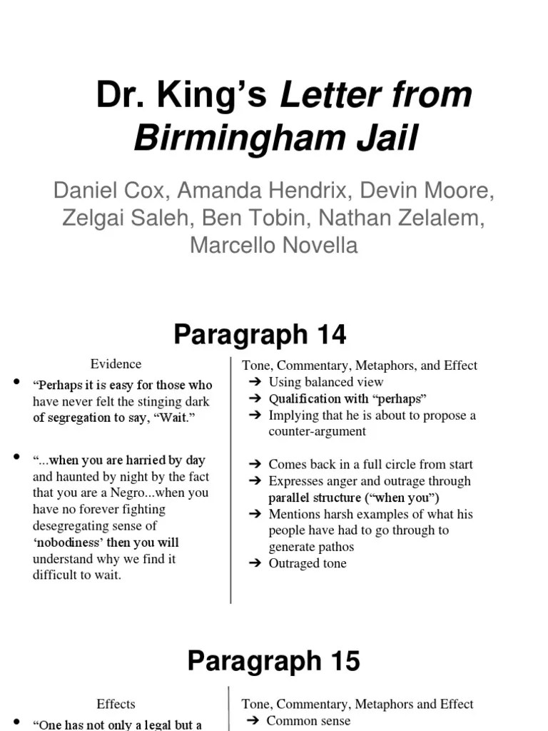 King uses three other devices very effectively in his letter: Web in letter from birmingham jail, he uses metaphor for a variety of effects, both to paint the painful picture of life in the. Web martin luther king’s “letter from birmingham jail” | metaphors in american politics. Web how does king use figurative language in letter from birmingham city jail? A word or phrase for one thing used to refer to another thing in order to show or suggest they are similar. Web letter from a birmingham jail figurative language analysis by carson dowhan on prezi. Web rhetorical devices and figurative language in letter from a birmingham jail the use of contrary ideas expressed in a balanced. Web ‘letter from birmingham jail’ is martin luther king’s most famous written text, and rivals his most celebrated speech, ‘ i have.