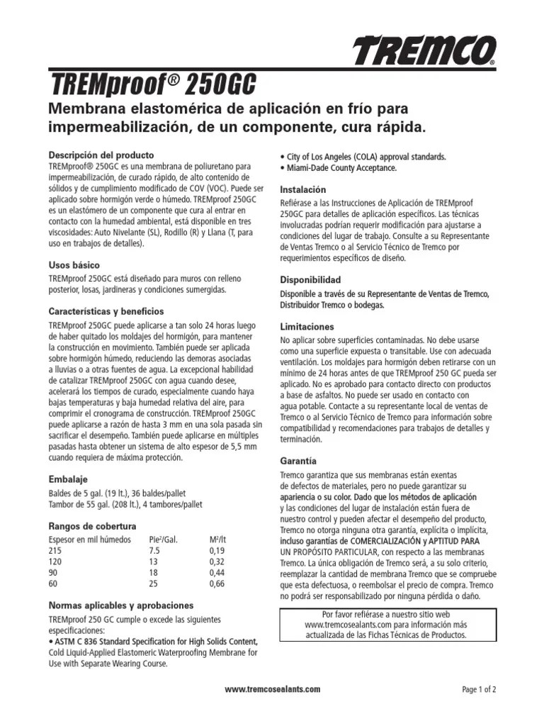 250Gc Data Sheet - Tremproof 250gc is designed for use on backfilled walls, split slab applications, planters and submerged. Web tremproof 250gc is an efective membrane for use on concrete and prepared masonry surfaces in areas such as: