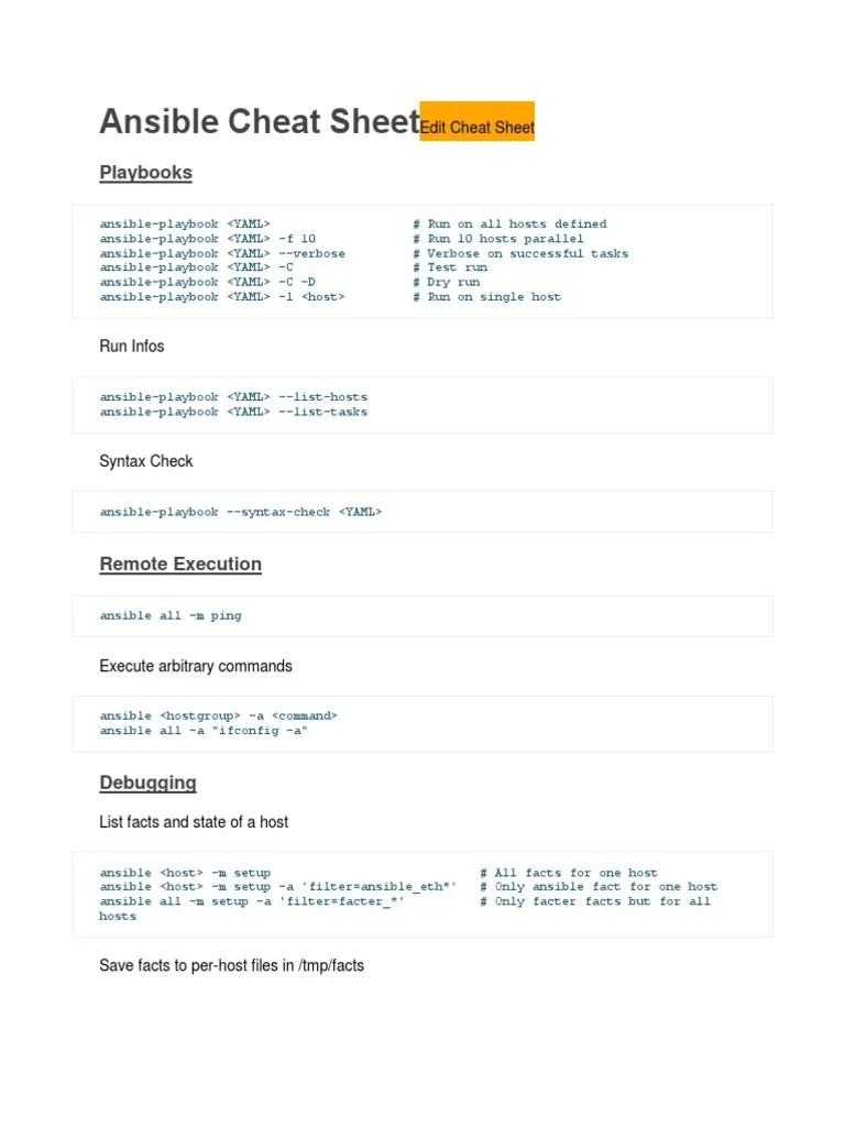 Ansible Cheat Sheet Pdf - Web download a pdf file with commands, options, and syntax for ansible playbooks and modules. This page shows one or more examples of each ansible command line utility with some common flags added and a link to the full documentation for the command. Also, the options and flags of ansible commands can be combined in various ways to achieve the desired results. This page shows one or more examples of each ansible command line utility with some common flags added and a link to the full documentation for the command. Web ansible cli cheatsheet. Web ansible cli cheatsheet. Remember to always use these commands with care and understand their implications, especially in a production environment.