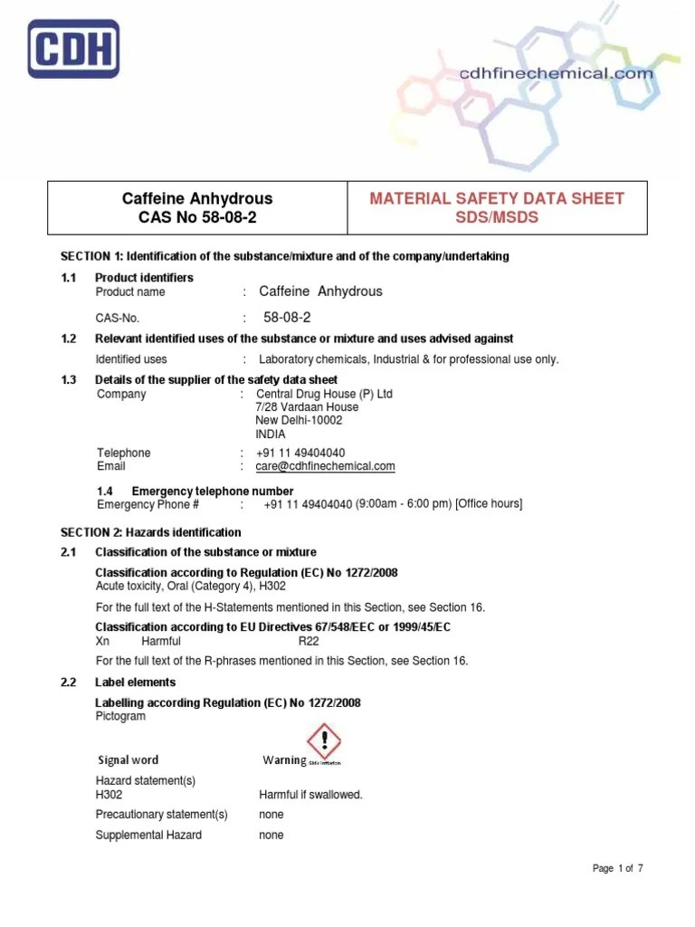 Caffeine Msds Sheet - Material safety data sheet or sds for caffeine 102584 from merck for download. 02.10.2015 page 1 of 6 caffeine, lab. Web safety data sheet for caffeine 102584. Version 6.10 revision date 03/02/2024 print date 04/13/2024. Chemical product and company identification. Web page 6/9 safety data sheet acc. Web safety data sheet according to 29cfr1910/1200 and ghs rev. To osha hcs printing date 04/19/2022 revision date 04/19/2022 trade name:caffeine (contd. Web product name caffeine (usp/fcc) cat no.