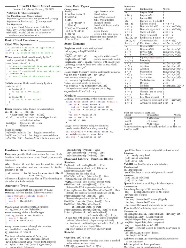 Chisel Cheat Sheet - \narguments given as kwd:type (name and type(s)) arguments in brackets ([… ]) are optional. Cheatsheet for the chisel hardware construction language: Web chisel3 testing cheat sheet. Chisel provides a evolving family of testers with different capabilities. \n other sections \n \n \n \n \n: A tester typically is invoked from scalatest. Web \n\n\n\n\n \n \n notation in this document: Web chisel 3.6 cheatsheet (v0) (page 1) chisel components bool, uint, sint, clock, reset, reg, wire, when, mux,bundle, record, vec, module: Web saved searches use saved searches to filter your results more quickly Class counterspec extends chiselpropspec { property(counter should wrap) { asserttesterpasses { new wraptester (42) } }