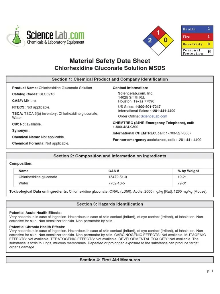 Chlorhexidine Safety Data Sheet - Recommended use uses advised against. Identification of the substance/mixture and of the company/undertaking. 17.03.2020 8 / 12 components: Version 6.5 revision date 03/02/2024 print date 04/06/2024. 03/17/2020 7 / 12 acute toxicity (other routes of administration) : Web chemical safety data sheet msds / sds. Identification of the substance/mixture and of the company/undertaking. Web safety data sheet chlorhexidine (20%) formulation version 2.1 revision date: Oral (drinking water) exposure time : Web safety data sheet according to regulation (ec) no.