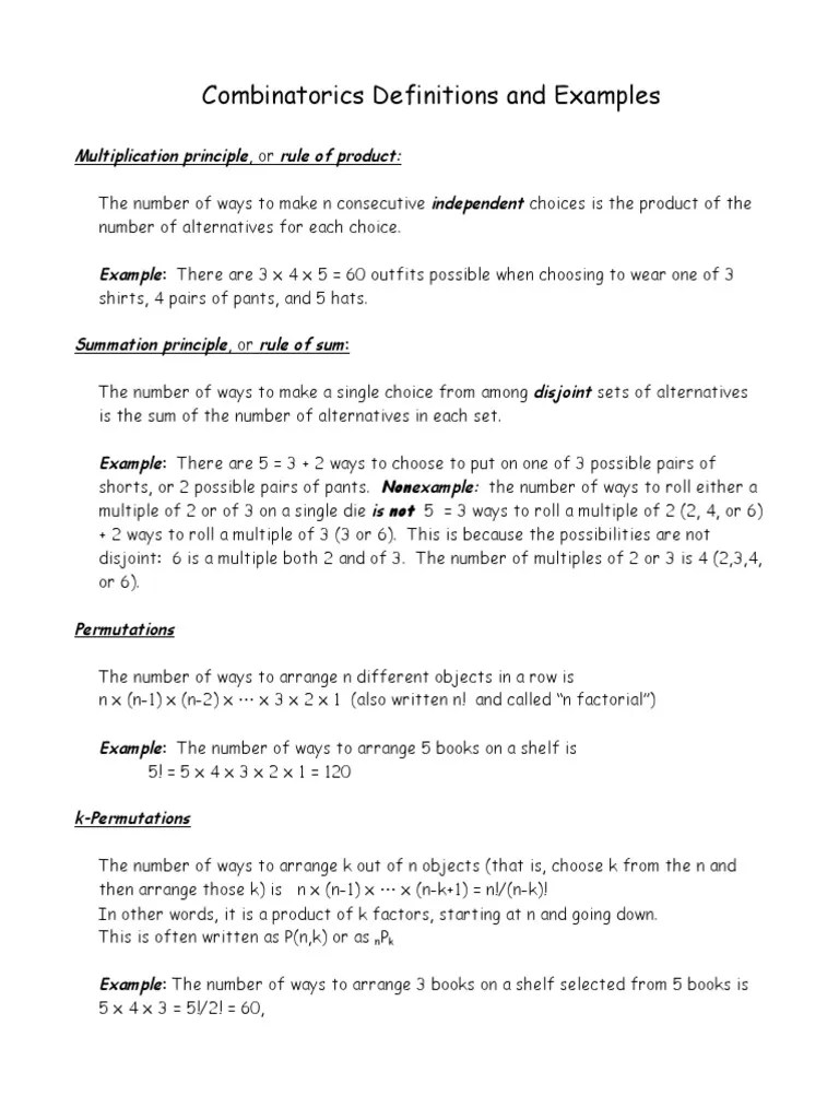 Combinatorics Cheat Sheet - ( 1)( 2) 3 2 1 special case : Of course, most people know how to count, but combinatorics applies mathematical operations to count quantities that are much too large to be counted the conventional way. Web ∗ combinatorics is a field of mathematics concerned with: N n c r r n r §· ¨¸ ©¹ permutations different objects : K) = n(n 1)(n 2) (n k + 1) n! Combinatorics is the mathematics of counting and arranging. How to define a sequence: Combinatorial techniques are applicable to many areas of mathematics, and a knowledge of combinatorics is necessary to build a solid command of statistics. Generalizations and specializations of relations between discrete str. Therefore, at the beginning of the second day, p