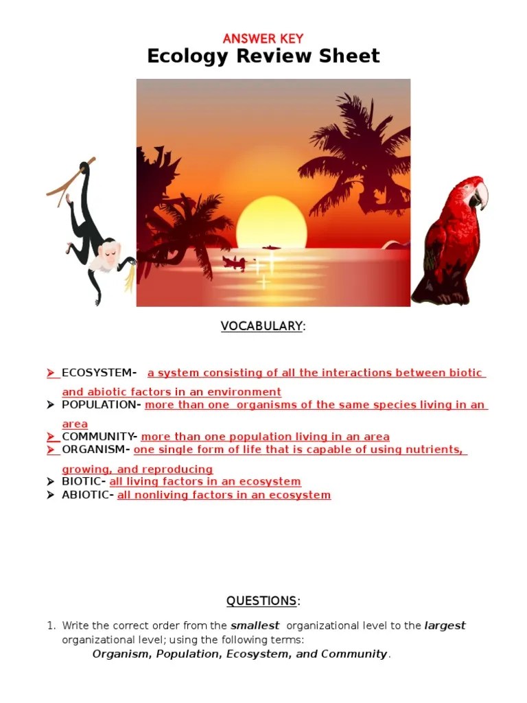 Ecology Review Sheet - Web this ecology review worksheet consists of 8 concept maps that will help your students review the concepts and is the perfect complement to your instruction. Web study with quizlet and memorize flashcards containing terms like organism, population, community and more. Each concept map includes a word bank with the exact amount of words for the number of boxes. Web ecology is the _____ of the _____ of organisms with one another and with their _____. An orgasnism that must ingest or east to get energy and organic compounds. Fill in the levels of organization from largest to smallest and describe each. If you can take this energy and turn it into food you are called an _____ or a _____. Ecologists study environments at different levels of organization. Organism that can capture energy from sunlight or chemicals and use it to produce its own food from inorganic compounds; Write a description of each level of organization in the table.