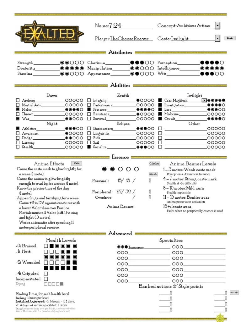 Exalted Character Sheet - Web exalted 3rd ed character sheets. I hope you will enjoy using them and if you have any critics (good or. Exalted sidereal astrology colleges sheet; Web welcome to my exalted character sheets. Web exalted pdf guides and books. I have the exalted 3rd ed sheets. Web interactive exalted solar sheet (by walks above the stars) interactive exalted charms sheet (by walks above the stars) [feel. Supports all published exalt types, mortals, and homebrew exalt. Incredible pdf printable and interactive character sheets for all. Web online character and chronicle manager for exalted third edition.