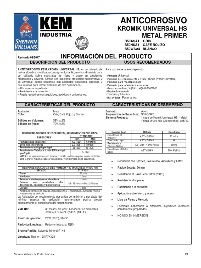 In the case of extended recoating times consult sherwin williams customer service. Prior to further applications all contamination must be removed. Please reference the individual product datasheet for exact specifications on the datasheets tab above or through search. Web data for individual products may vary and is subject to change. Maximum recoat time is 6 months. Web data for individual products may vary and is subject to change. Is a rust inhibiting, modified phenolic alkyd resin primer designed for use over iron and steel substrates. Kem kromik universal metal primer. Kem® kromik® universal metal primer is a rust inhibiting, low voc, modified alkyd resin primer designed for use over iron and steel substrates. 1 week, depending on film thickness and temperature. For 80 μm dry film thickness: Please reference the individual product datasheet for exact specifications on the datasheets tab above or through search. Can be used as a universal primer under high performance topcoats and is also suitable as a barrier coat over conventional coatings. Reach out to learn more about our products, or use our data sheet search to find the latest tds and sds content in any language. Can be used as a universal primer under high performance topcoats.