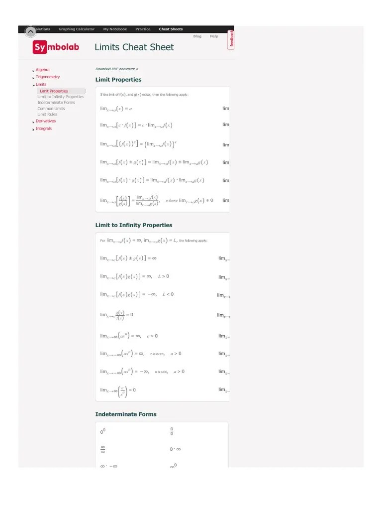 Limits Cheat Sheet - Except we require x large and negative. What happens when we use direct substitution? The limit of f(x) as x approaches a: The limit doesn't exist (probably an asymptote). © 2005 paul dawkins limits definitions precise definition : The value to which the output (dependent variable) of f(x) approaches as x (independent variable) approaches the number a. There is a similar definition for lim f(x) = l. Same definition as the limit except it requires x > a. G ( x) = x − 3 x + 5 − 3. The limit doesn't exist (probably an asymptote).