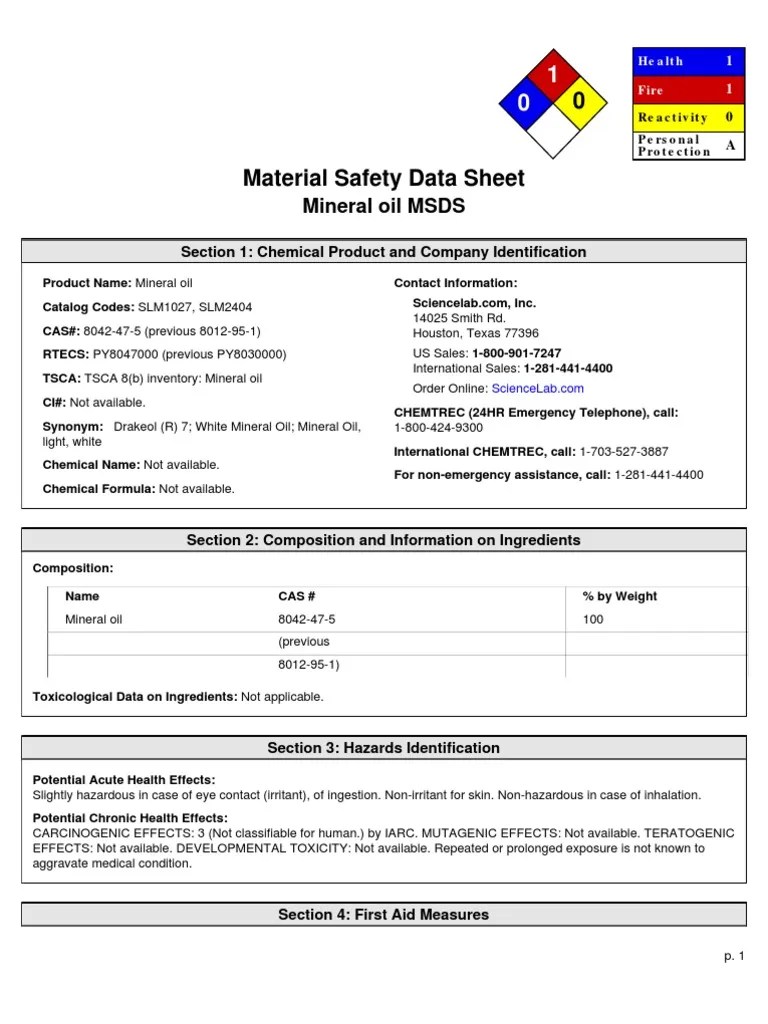 Mineral Oil Safety Data Sheet - Mineral oil flinn scientific sds sheets learn health and safety information about chemicals. Version 6.10 revision date 03/02/2024 print date 04/13/2024. H304 may be fatal if.