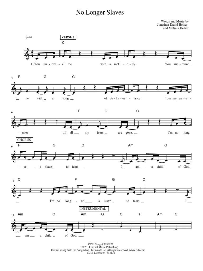 No Longer Slaves Piano Sheet Music - Piano/vocal (satb) no longer slaves sheet music pdf (bethel music / jonathan david helser / melissa helser) piano/vocal (satb) ab, g. 1 part • 5 pages • 04:09 • aug 22, 2021 • 1,072 views • 87 favorites. Web no longer slaves sheet music by bethel music. Chords & lyrics all keys. This song was arranged by daniel galbraith in the key of a, ab, b, bb, c, g. Download the sheet music for no longer slaves (radio) by bethel music / jonathan david helser, from the album we will not be shaken. Sheet music arranged for piano/vocal/chords, and singer pro in bb major (transposable). Web browse our 5 arrangements of no longer slaves. sheet music is available for piano, voice, guitar and 2 others with 6 scorings and 1 notation in 5 genres. Find your perfect arrangement and access a variety of transpositions so you can print and play instantly, anywhere. Jonathan david helser, joel case and brian johnson.