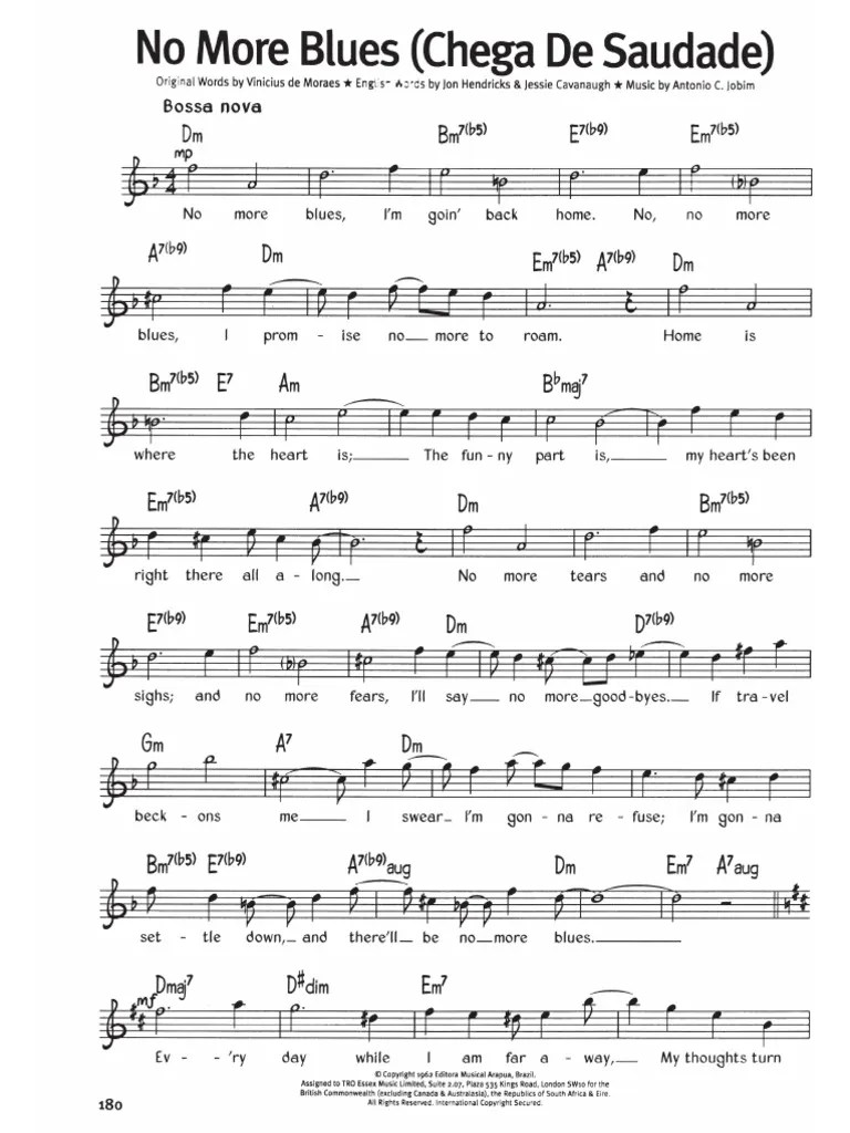 No More Blues Lead Sheet - Print and download pdf in all keys. Chords and lead sheets included (bass flute, flute, guitar, harp, harpsichord, mandolin, oboe, organ, piano, piccolo, recorder, violin). Web download & print chega de saudade (no more blues) for voice and other instruments (in c) by antonio carlos jobim. Web download & print chega de saudade (no more blues) for voice and other instruments by antonio carlos jobim (real book with lyrics). Official publisher pdf (downloadable/printable) access anywhere, including our free app. Separate lead sheets for concert instruments and bb instruments included with purchase. Composer antonio carlos jobim jessie cavanaugh jon hendricks vinícius de moraes. Chords, lead sheet and lyrics included. Arrangement lead sheet / fake book.