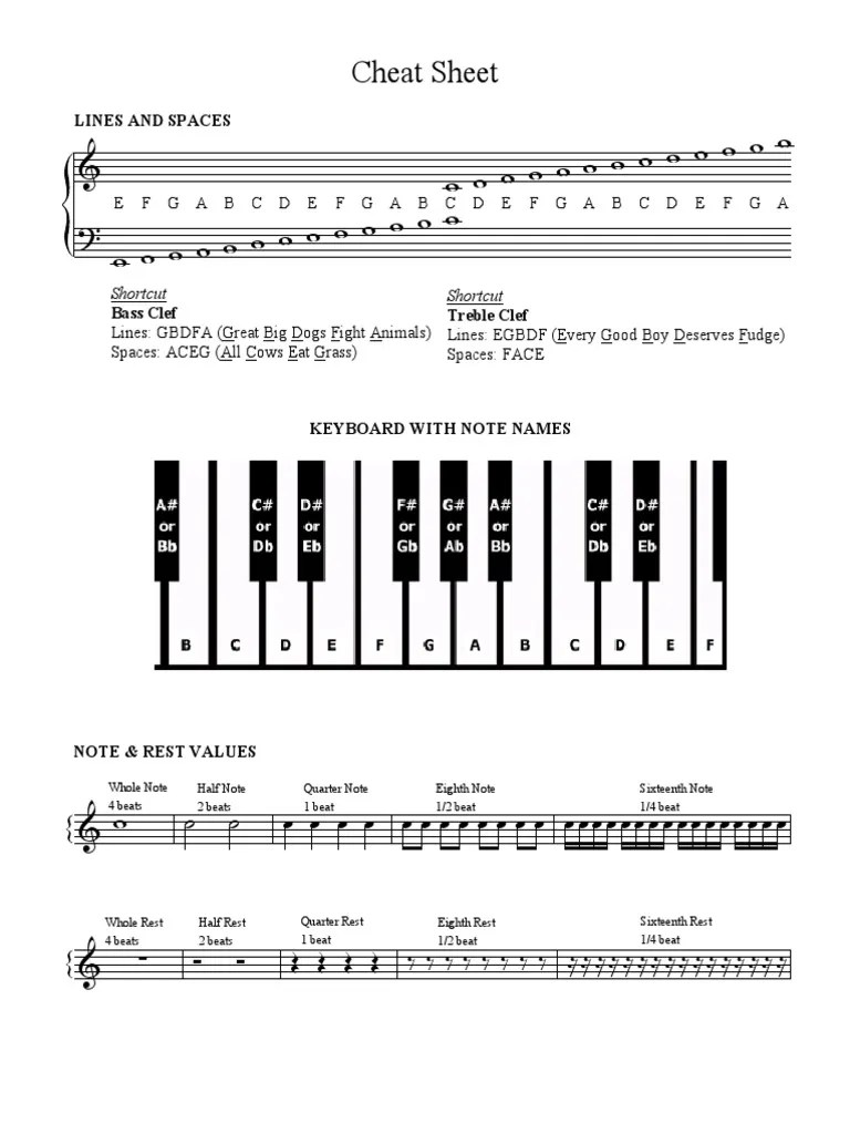 Reading Piano Sheet Music Cheat Sheet - Treble clef and bass clef. We include detailed descriptions and visuals. How to read piano notes. Web learn how to read sheet music and improve your skills with musicnotes.