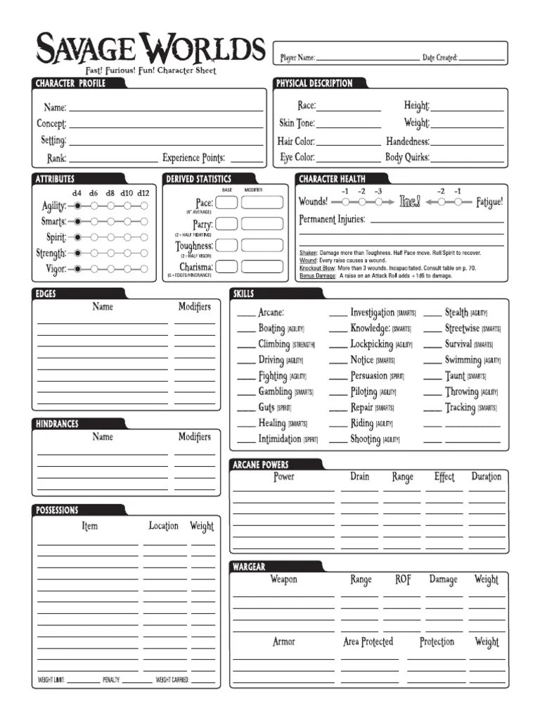 Version differences (download all three to see which is right for you!) 2022 print version: Combat & chase maneuvers quick reference charts. This includes the character sheet with a portrait style form fillable pdf. There are versions with print friendly layers and options to print traits as blanks or dice you can color in to show your hero’s ability. Web a character sheet for the savage worlds adventure edition (swade) roleplaying game. Based on the rogues gallery cards from the super powers companion, and the old training wheels sheet. A form fillable digital character sheet! Savage worlds is the core ruleset for all of pinnacle’s roleplaying games. The current version is the savage worlds adventure edition, o. This free download gives you a set of two character sheets to print and use with our savage worlds adventure edition rpg!