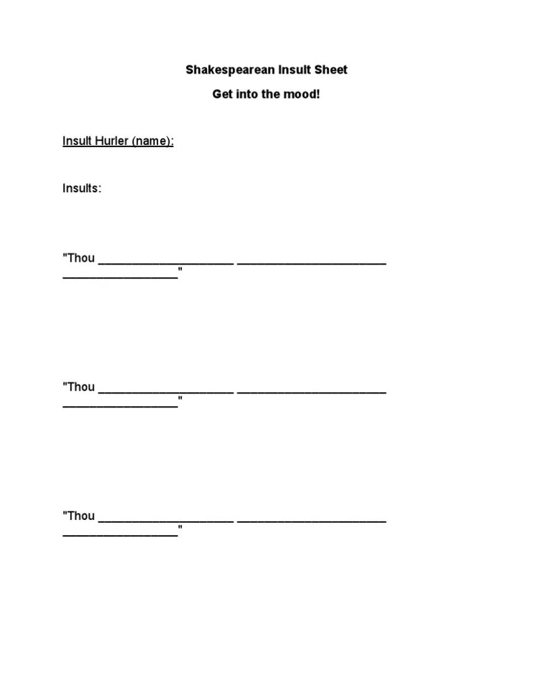 Shakespearean Insult Sheet - “a most notable coward, an infinite and endless liar, an hourly promise breaker, the owner of no one good quality.”. Web top 55 shakespeare insults: Web get your tongue around shakespeare’s language with this simple insult generator and develop an understanding of dramatic conflict. By using these insults, you are adding some humor to your conversations and appreciating the artistry and creativity of shakespeare’s language. Have fun with shakespearean language! Make certain thou knowest the meaning of thy strong words, and thou shalt have the perfect insult to fling at the wretched fools of the opposing team. Web shakespearean insult sheet directions: An additional vocabulary sheet helps with words no longer in use. Download resource (990.5 kb) come and learn from us in person! Web in which plays can a good shakespeare insult be found?