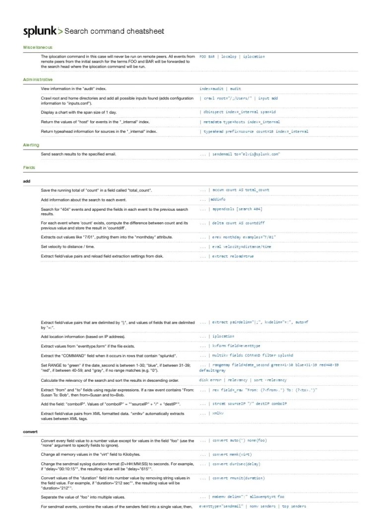 Splunk Cheat Sheet - Web splunk quick reference guide. Custom functions and data types. This guide covers key concepts, commands and functions for data strategy, security, compliance and more. This quick reference guide covers events, metrics, fields, tags, indexes, reports, dashboards, alerts, datasets, data models, apps, and more. Find examples of basic searching, filtering, formatting, functions, sorting, grouping, subsearches, saving and scheduling searches. Find out how to get data into splunk, create dashboards, and explore spl and regex. Compatibility library for spl commands. Web learn the basics of splunk products, features, and commands with videos, guides, and cheat sheets. See the table of functions with descriptions and examples for each one. Web learn how to use the eval command and common functions to calculate expressions and put them into fields.