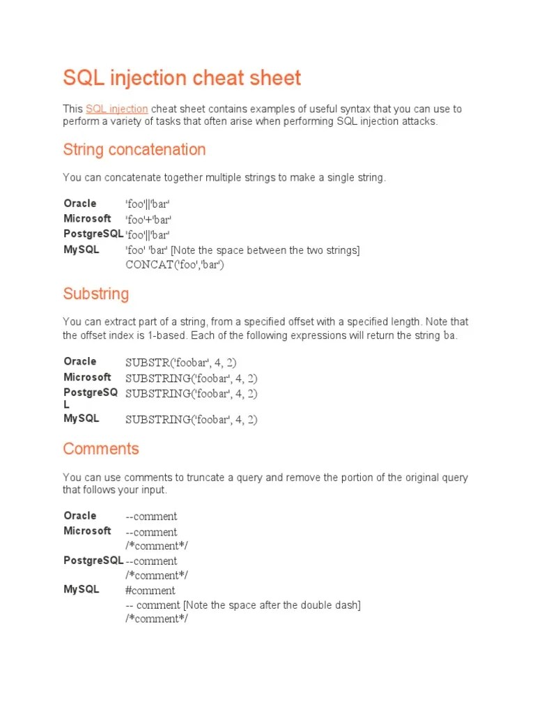Sql Injection Cheat Sheet Pdf - This is the most straightforward kind of attack, in which the retrieved data is presented directly in the application web page. Web sql injection can be broken up into 3 classes. This cheat sheet will help you prevent sql injection flaws in your applications. Web learn how sql injection attacks happen and how to fix your code that has sql injection vulnerabilities. Sql injection attacks are common because: It will define what sql injection is, explain where those flaws occur, and provide four options for defending against sql injection attacks. This cheat sheet covers the types, examples, and defenses of sql injections in various programming languages and databases. You can concatenate together multiple strings to make a single string. Web this sql injection cheat sheet contains examples of useful syntax that you can use to perform a variety of tasks that often arise when performing sql injection attacks. Sql injection vulnerabilities are very common, and.