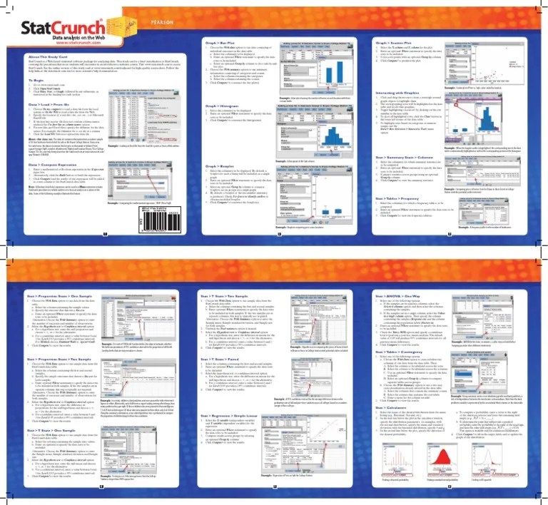 Statcrunch Cheat Sheet - Pie charts with summary data. Pie charts from raw data. Web charting values across multiple columns. The mean age of respondents is shown to be roughly 29.31, and the median age of the respondents is much lower at a value of 23. To generate the table of summary statistics shown below. Stat>regression>simple linear>enter x & y variables>change the inequality in the hypothesis>compute! Simple bar plots with summary data. Simple bar plots with raw data. Web to accomplish this task, select the stats > summary stats > columns menu option. Web statcrunch may be used on any computer that has access to the internet.