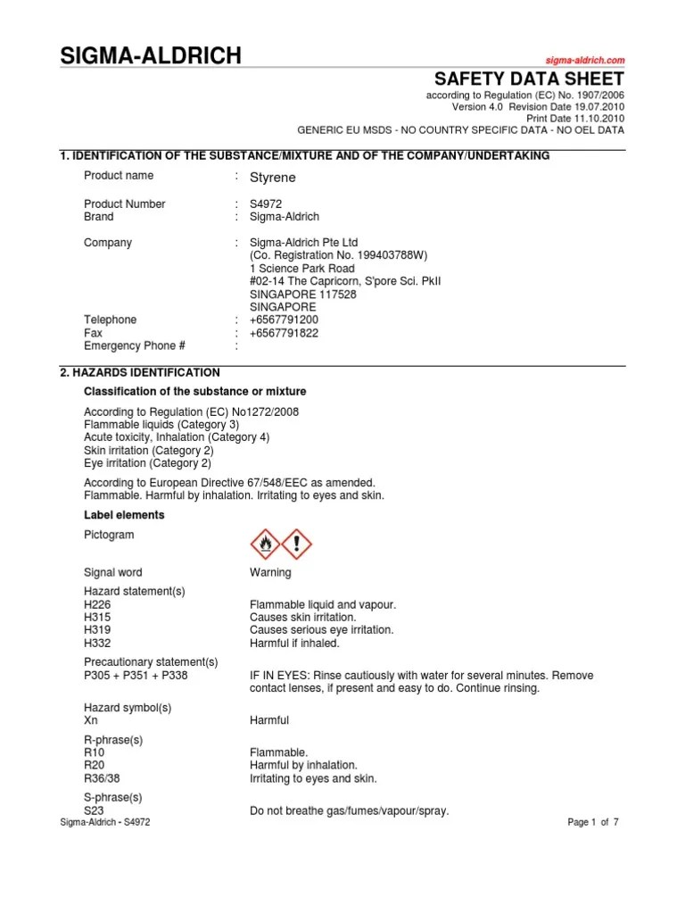 Styrene Msds Sheet - If you are not able to see the sds please use this link to download it: Recommended use uses advised against. Identification of the substance/mixture and of the company/undertaking. View or download the styrene msds (material safety data sheet) or sds for 807679 from merck. Web material safety data sheet or sds for styrene 807679 from merck for download or viewing in the browser. Show this material safety data sheet to the doctor in attendance. Ghs 1.0 date of compilation: Web safety data sheet according to the united nations’ globally harmonized system (un ghs) date / revised: 30054340/sds_gen_00/en) date of print 29.03.2024 chemical nature styrene (content (w/w): 1907/2006 (reach) styrene version number: