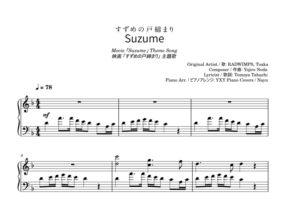 Suzume Piano Sheet Music - Web download sheet music for suzume no tojimari. Available only for piano scores. Choose from suzume no tojimari sheet music for such popular songs as suzume, time for two, and suzume (main theme). So if you like it, just download it here. Web free suzume piano sheet music is provided for you. Suzume is used as the theme song for japanese animated fantasy adventure film suzume no tojimari. Print instantly, or sync to our free pc, web and mobile apps. And it is sung by singer toaka.