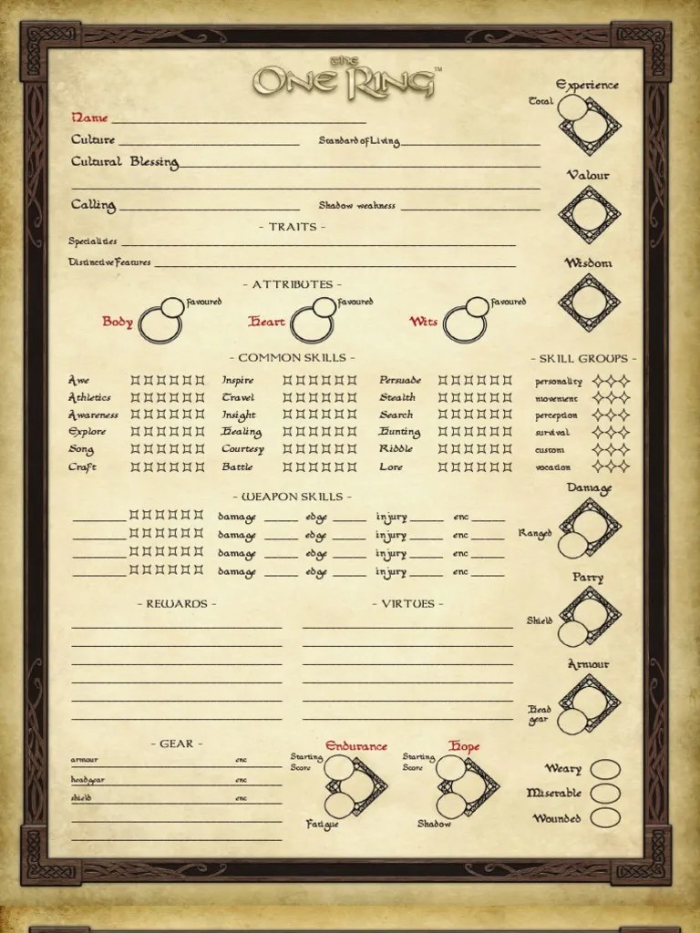 Web character sheet for the one ring. Improved and cleaned from revised version by francesco nepitello (published in his blog). It's all free and ava. I remember using an online generator for 1st edition and was wondering if there's something similar for the free league version. Character sheet for use with the second edition of the one ring rpg. Web the one ring 2nd edition rpg custom character sheet. We have taken the existing the one ring sheet that was published with limited layout and functionality, and built on it to ensure compatibility as well as covering the new character sheet. Calculate your target numbers (new for the 2nd edition of the one ring rpg) calculate your endurance, hope, and parry Web the one ring 2nd edition has been released and delivered as pdf, so the character sheet and roll mechanics is now official. Is there any character generation online tool for the one ring 2nd edition? Web the one ring 2e rpg character sheet. This is the official layout included in the second edition core rulebook. Web any character creation tool for tor 2nd edition? Web here's the loose order of operations when it comes to character creation in the one ring rpg 2nd edition (and a handy table of contents):