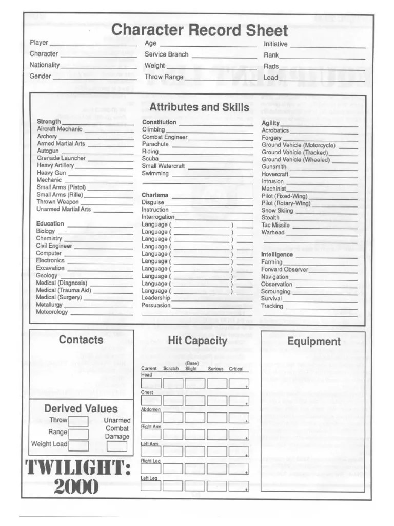 Twilight 2000 Character Sheet - A, b and so on). T2k4 character sheet swedish color. T2k4 character sheet english color. Web t2k 4e character sheets (fillable) the attributes and skills are filled in with capital letters (i.e. T2k4_battle_maps.pdf (16 pp.) t2k4_card_backs.pdf (62 pp.) t2k4_card_fronts.pdf (62 pp.) t2k4_character_sheet_english_color.pdf (1 p.) Enter weight in numbers (0,25; Web mitch berg's twilight 2000 character generation site. The small number in each gear section is for weight. 0,75 or 1) for each row. This site is designed to provide a resource for generating more interesting, more detailed, more complete characters for.