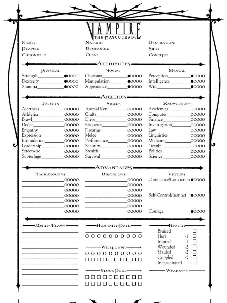 Vampire The Masquerade 5E Character Sheet - Web here a collection of unofficial vampire: It is intentionally streamlined and limited to. Web vampire the masquerade 5th ed. The masquerade' v5 character creation tool for beginners. Web v5 character sheet pdf (formfillable) you will find the most recent state of the character sheets in his vtm5e. Web this is a 'vampire: Create and download a free vampire the. The masquerade 5th edition character sheets.