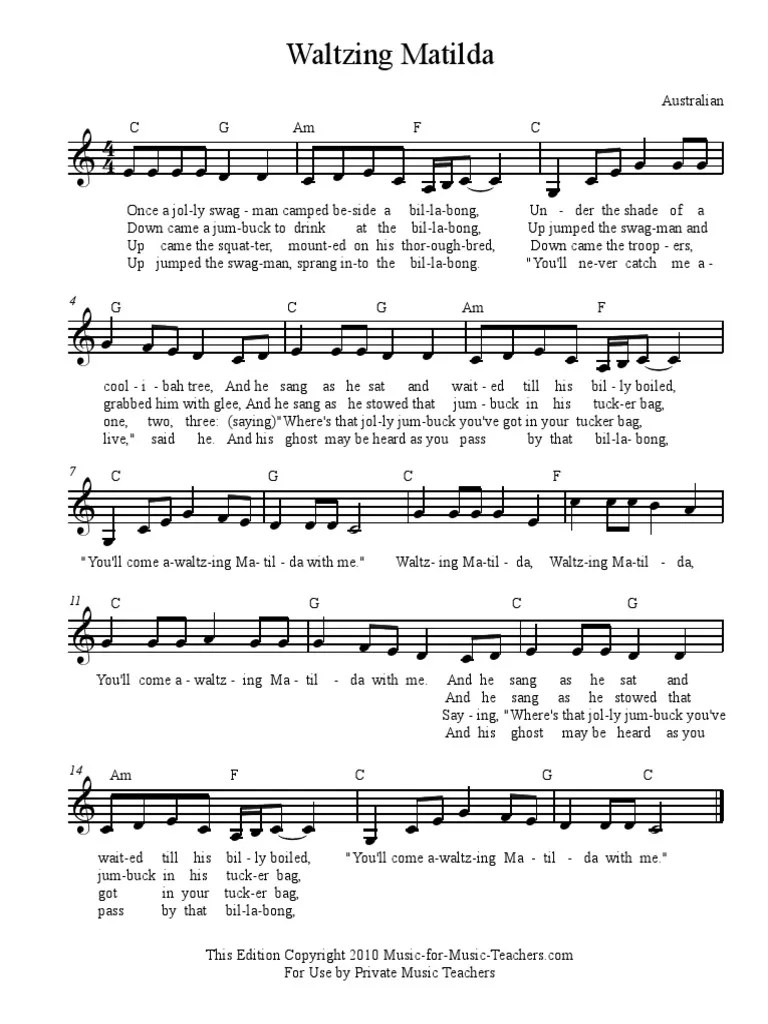 Waltzing Matilda Sheet Music - Web free waltzing matilda by misc tunes sheet music | download pdf or print on musescore.com. Web sheet music from www.mfiles.co.uk. Web browse our 9 arrangements of waltzing matilda. sheet music is available for piano, voice, guitar and 2 others with 8 scorings. (unofficial national anthem of australia) traditional.