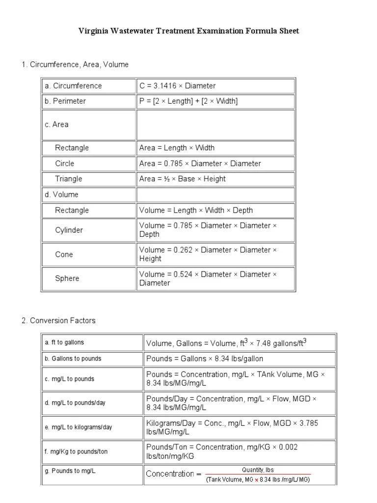 Wastewater Exam Cheat Sheet - Web abc formula/conversion table for wastewater treatment, industrial, collection and laboratory exams. The table below summarizes the areas that are included on the exam, the number of test questions in each of these areas, and the. Web the following is a general outline to serve as a study guide in preparing for the grade 1 examination. All areas may not be covered on any one exam, nor does the outline necessarily include all topics, which may appear on an exam. These job tasks have been categorized into the content areas detailed in the following pages. Wef’s new line of operator training, wastewater treatment fundamentals, helps operators prepare for the first three levels of certification examinations and qualify for continuing education credits. Web exam content the wastewater treatment operator class ii exam will test you on essential job tasks. (titrant volume, ml) (acid normality) (50,000) alkalinity, as mg caco3/l = sample volume, ml. Web wastewater collection system operator certification studybook;
