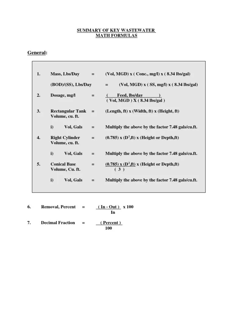 Wastewater Formula Sheet - Web abc formula/conversion table for wastewater treatment, industrial, collection and laboratory exams. 7.48 gal = 1 cu ft. (titrant volume, ml) (acid normality) (50,000) alkalinity, as mg caco3/l = sample volume, ml. 3 ft = 1yd 5,280 ft = 1 mi 144 sq in = 1ft2 43,560 ft2 = 1 acre. Web abc & c2ep formula/conversion table for wastewater treatment, industrial, collection, & laboratory exams. Area of circle = (0.785) (diameter2) or (π) (radius2) area of cone (lateral area) = (π) (radius) radius 2 + height 2. (titrant volume, ml) (acid normality) (50,000) alkalinity, as mg caco3/l = sample volume, ml. Web wastewater formula sheet and conversion factors. 27 cu ft = 1 cu yd. *area of circle = (.785) (diameter2).