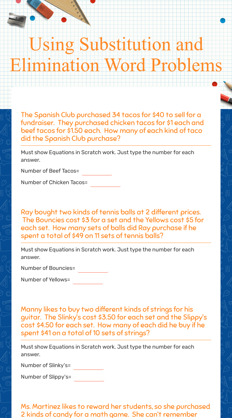 Elimination Word Problems - If any coefficients are fractions,. Write both equations in standard form. Web sal solves a word problem about the weights of tvs and dvds by creating a system of equations and. Web to solve a system of equations by elimination. Web learn how to solve systems of linear equations using the elimination method with examples and practice problems.