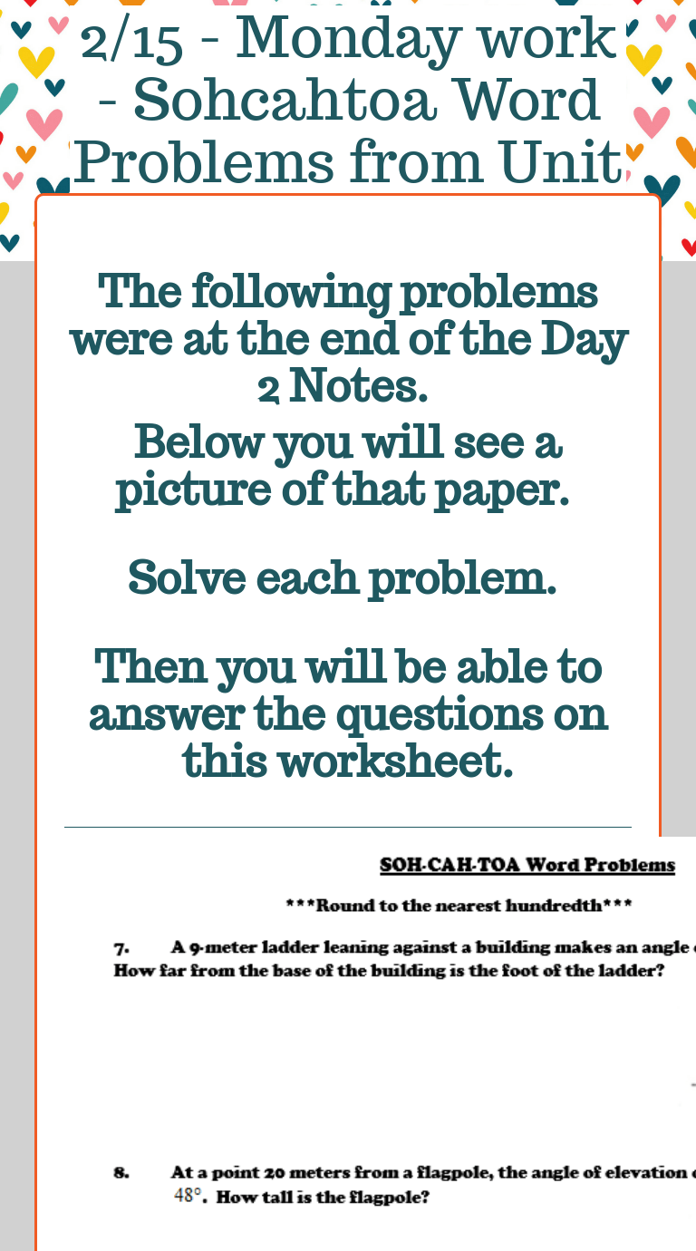 Sohcahtoa Word Problems - The word problems will involve drawing a diagram to fit with the scenario, and then using sin, cos, or tan to calculate a missing length or angle. Web this set of 10 questions will give learners an opportunity to practice applying their knowledge of right angled trigonometry (sohcahtoa). All four of the sides measure 10 inches. Express answers as a fraction in lowest terms. The following diagram shows the sohcahtoa formula for sin, cos, and tan. If the frame is square what will the measure of the diagonal be? Here we will learn how to use sohcahtoa and trigonometry to find unknown sides and angles in right angled triangles. Scroll down the page for more examples and solutions on sohcahtoa. What is sohcahtoa and how to use the trig ratios to find missing sides and missing angles on right triangles? Susan wants to make sure that her frame is perfectly square.