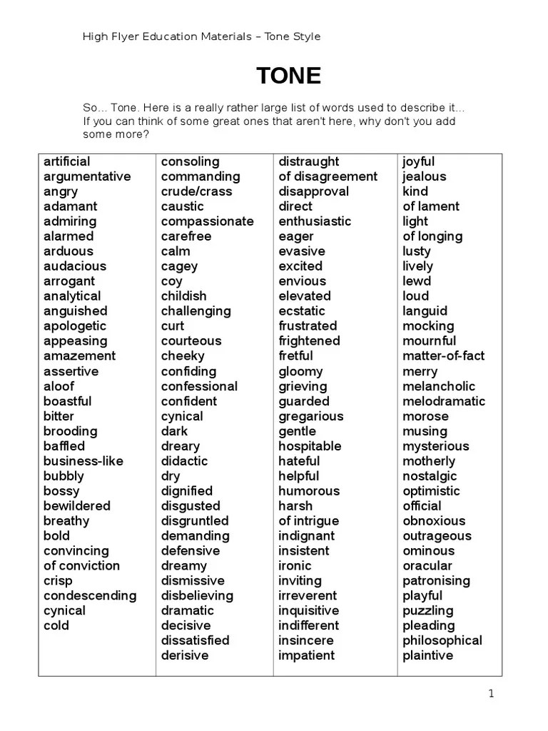 Tone Word List - Web some tone words might have multiple or all possible connotations, as their meaning might and mood might depend on their context. In this article, we’ll talk about what tone words are, analyze their use in several examples, and give a list of tone words. Any tone words list (worth the time it takes to make it) should provide the fuller meaning of each word — i.e., not just. Web tone words are used to help express that attitude. Web tone can bring life into a story in a myriad of ways. Web 175 words to describe tone for authors. To regard with extreme aversion; Find the word that's right on the tip of your tongue to describe a piece in this list of tone examples.