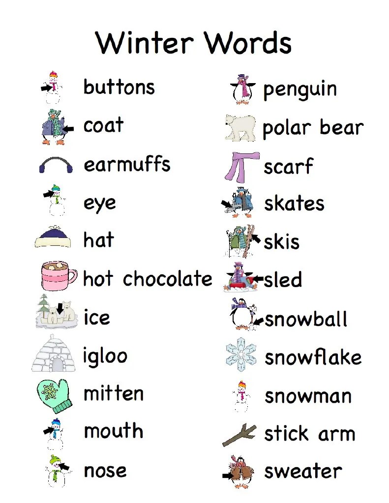 Winter Word List - Web a list of words that start with each letter of the alphabet, organized by theme and alphabetical order. An intense snowstorm accompanied by powerful winds and reduced sight. (this post may have afilliate links. The list is useful for students and teachers who want to learn or review winter vocabulary. The words are related to winter, such as anorak, arctic, ice, snow, and wintertime. Soft, white frozen water particles that fall from the sky in winter. Web winter weather words.